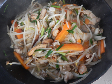 1.フライパンに油を入れて中火で熱し、豚肉、シーフードミックス、にんじんを入れて炒める。