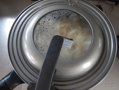 2.豚肉に火がとおってきたら水、鶏がらスープの素、みりん、もやしを入れて蓋をして煮る。