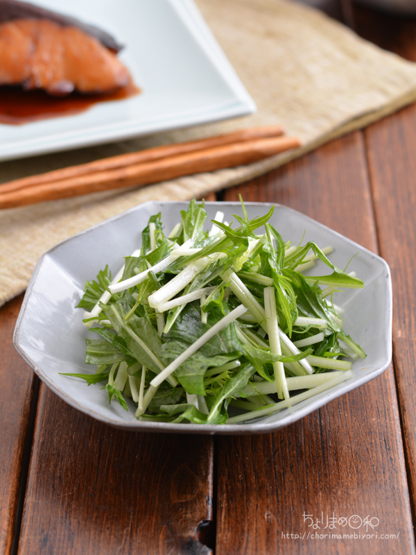 水菜をオリーブ油でからめてから、酢、塩こしょうで調味。