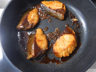 ブリの厚みに応じて焼き加減が変わりますが、厚みの半分くらいが色が白っぽくなって来たら裏返して、同じ時間焼いてたれをからめ、仕上げに蒸すとふっくらと仕上がります。