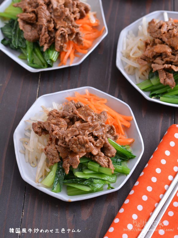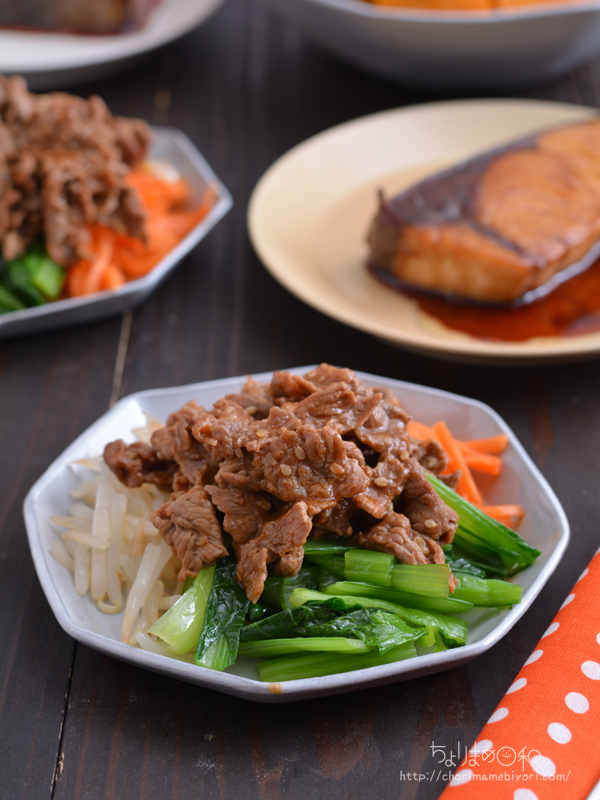 5.皿に三種のナムルをのせ、 【4】を中央にのせる。