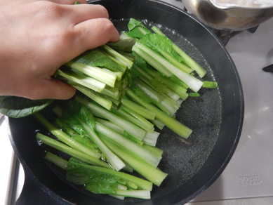 青菜はほうれん草でもよいのですが、食べ応えのある小松菜を。