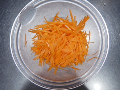 にんじんは塩と酢を入れて塩酢もみで特有の香りを排除。