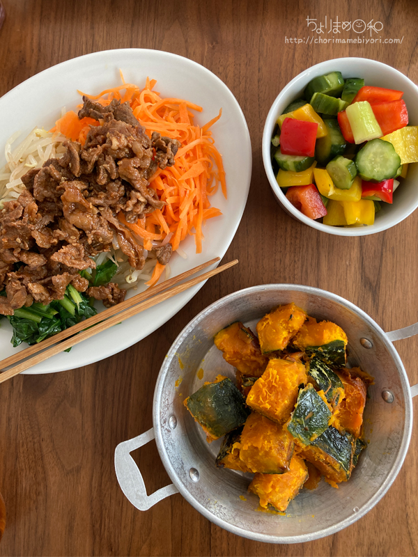 韓国風牛炒めのせ三色ナムルとかぼちゃの塩バター