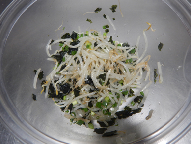 3.もやしとごま油を合わせて和え、ちぎったのり、塩、粗びき黒こしょうを入れて和える。