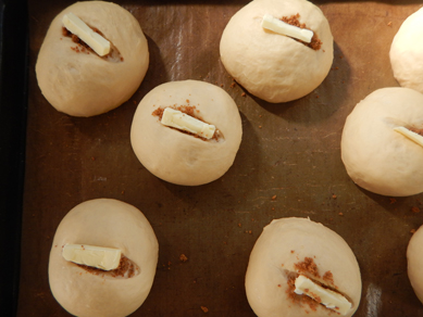 6.生地の天面にクープナイフで切り込みを入れる。切り込みにココナッツシュガー、バターの順ではさむ。