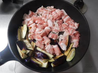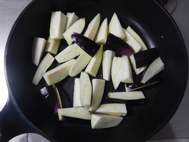 1.フライパンになす、油を入れて和え、蓋をして3分ほど蒸し焼きする。途中何度か焼き位置を変える。