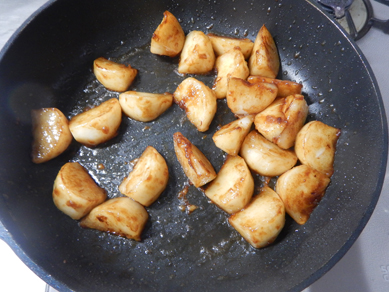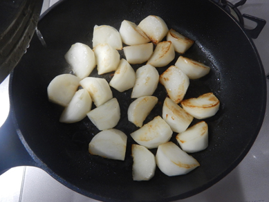 2.かぶに焼き色がついたらしょうゆ、わさびを入れてひと焼きする。