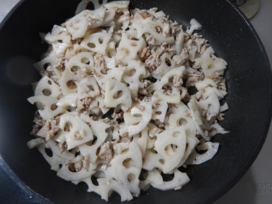 2.豚肉に大方火が通ったら、れんこんを入れて炒める。