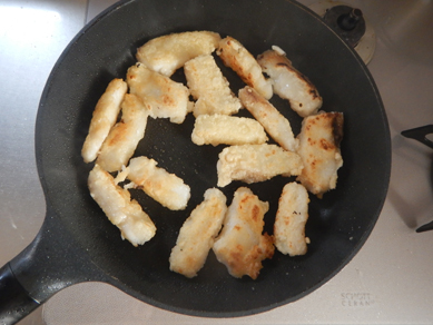 2.フライパンに油を入れて中火で熱し、【1】を入れて全体をこんがりと焼く。途中油が足りない場合は差し油をして全体的に焼く。