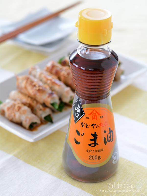 豚巻きを焼いた純正ごま油濃口が、、この油でごはんがすすみます。