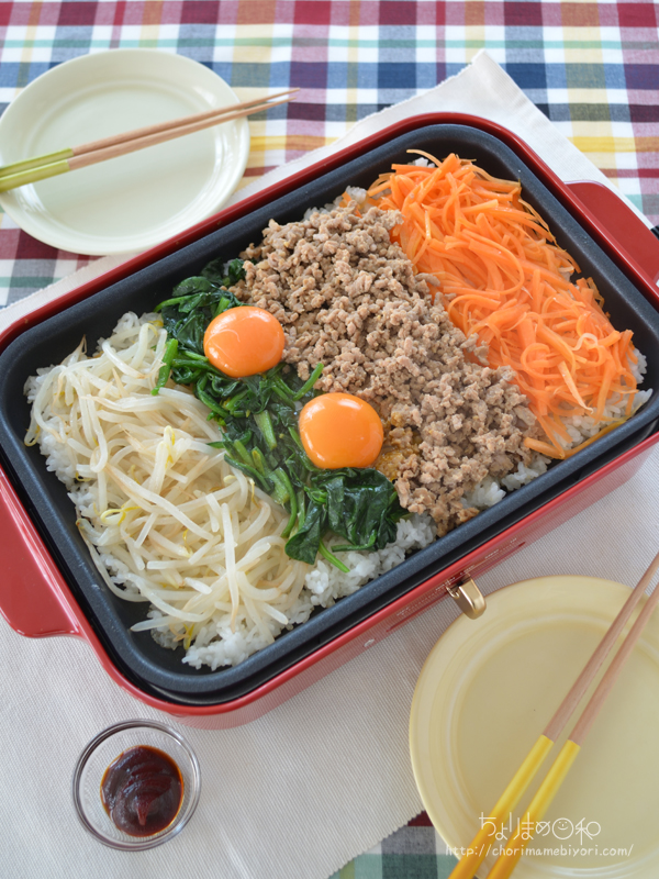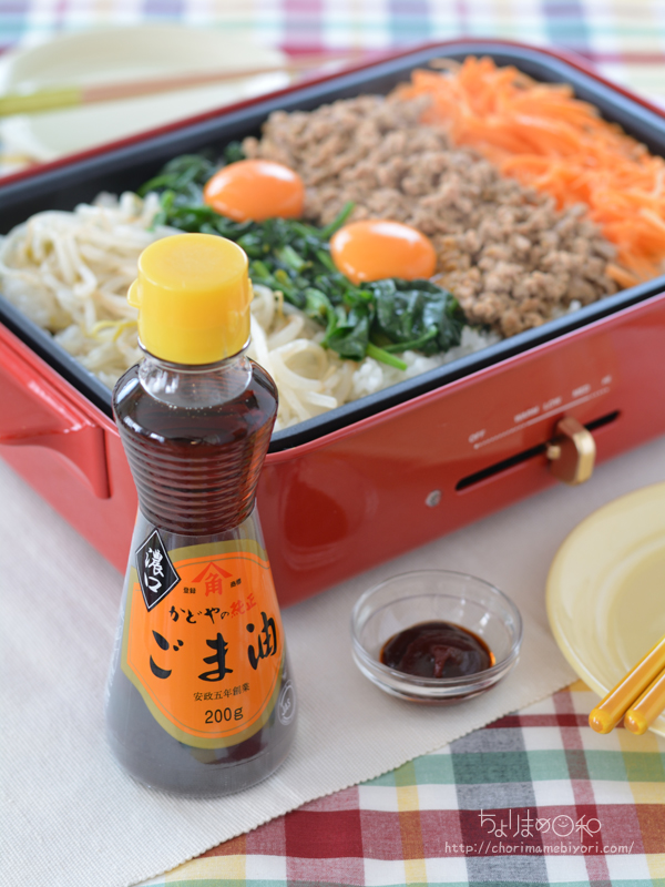 鮮やかさNO.1のホットプレート飯!石鍋の代わりをホットプレートがしてくれるので、大人数でいただくベストごはんです。 肉みそはレンジで簡単に。もやし、ほうれん草、にんじんの三色ナムルは手間を最小限にし、味付けもシンプルに。 純正ごま油濃口をそれぞれの食材に使用することで、どの具材を食べても、合わせて食べてもしっかりとコクと統一感のある味に仕上がります。