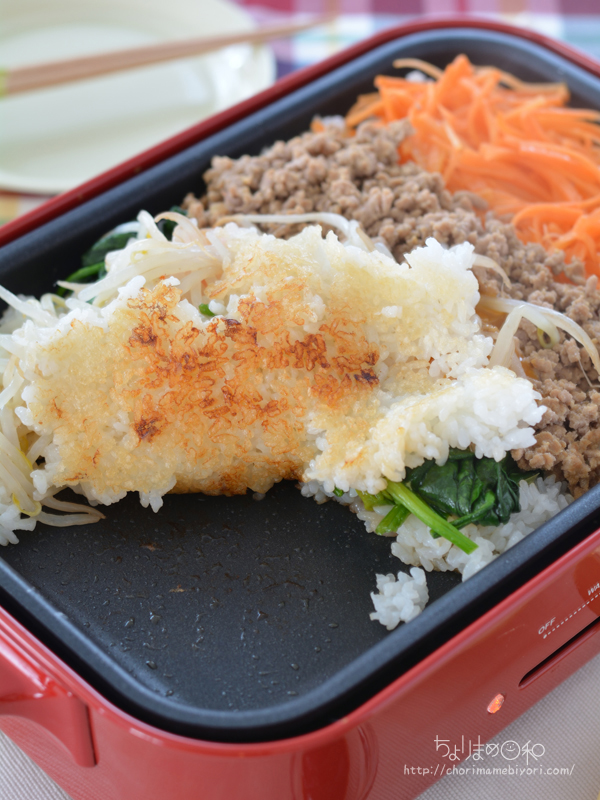 ホットプレートにごはんをしいて、たっぷりの具をのせて完成!