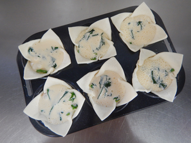2.ベーコン、ほうれん草を等分に分けて入れる。