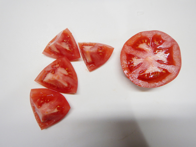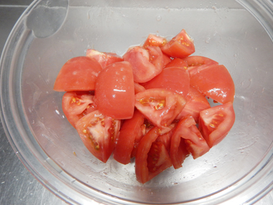 ・トマトはヘタをとり、乱切りにする。(2等分に切ってから乱切り)