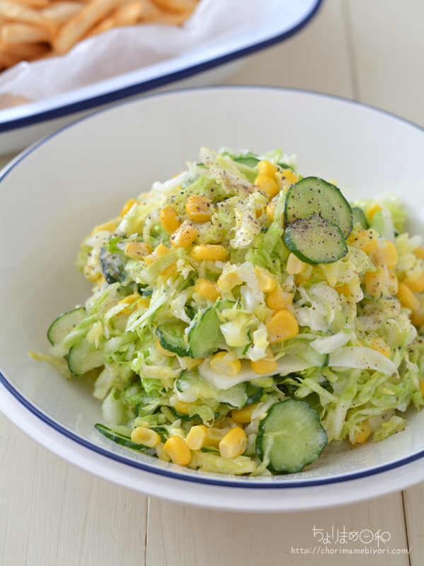 キャベツ、きゅうりを塩もみしたら、オリーブ油1、ヨーグルト2を和えて、こしょうで調味。