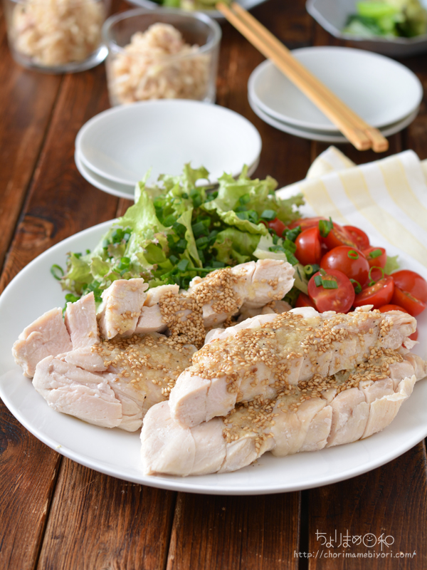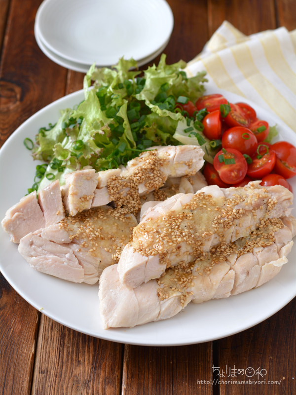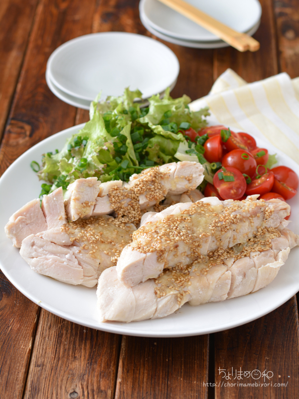白い蒸し鶏と香味ごまだれで食がすすむ!