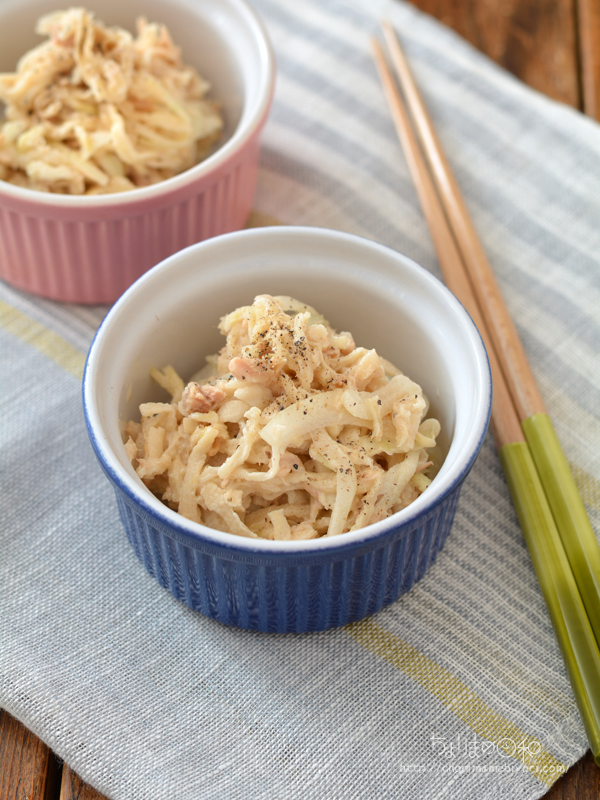 2.ボウルに切り干し大根、ツナ(オイルごと)、水気をきった玉ねぎ、Aを合わせて和える。