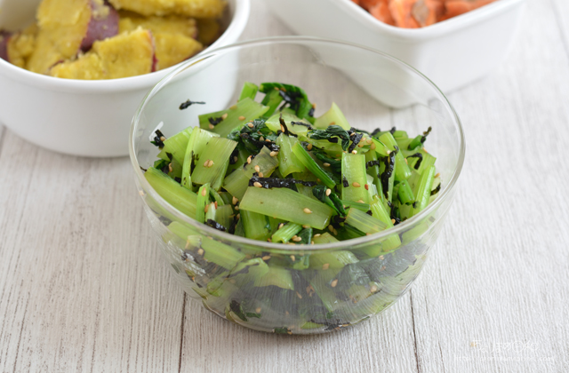 しょうゆで洗って水気をしぼり、いりごま、きざみのりであえてしょうゆで調味。