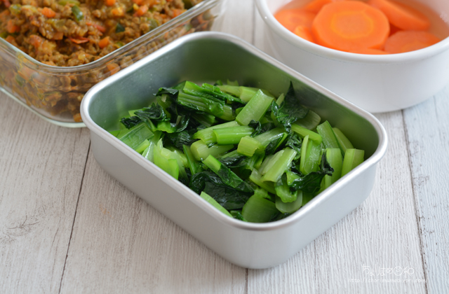 小松菜は塩ゆでしてオイルでからめて塩で調味。