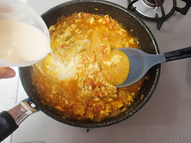 3.トマトが全体に行き渡ったらAを加えてひと炒めする。火を止めて豆乳を加え、冷ましておく。