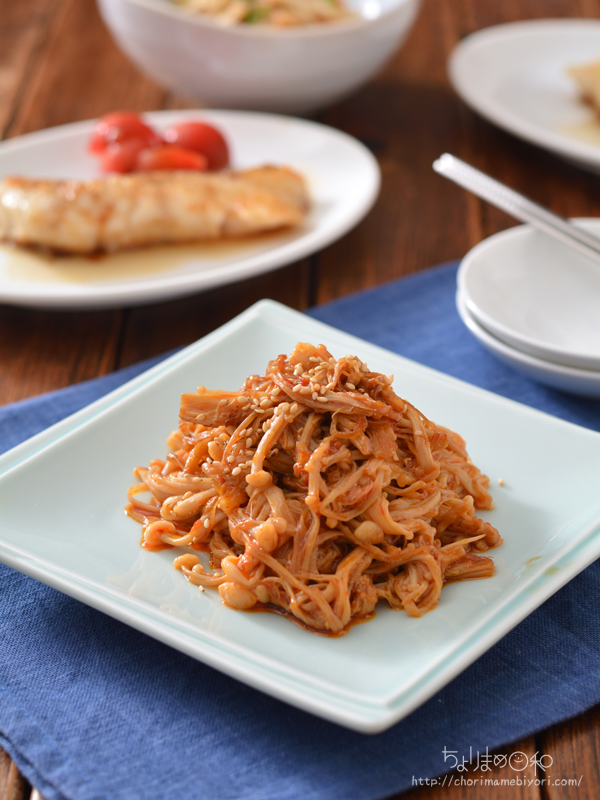 1.フライパンにごま油、豆板醤を入れて中火で熱し、えのきをほぐし入れて炒める。