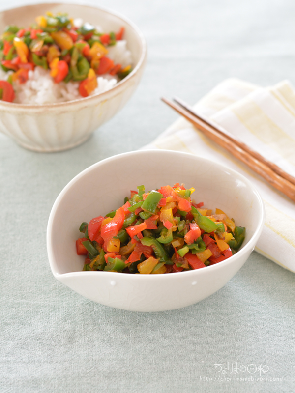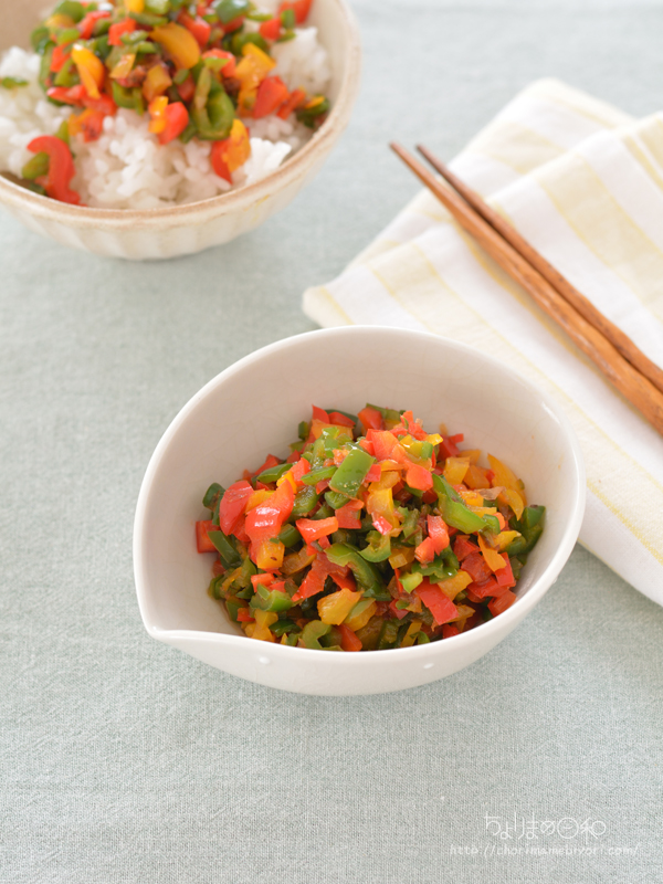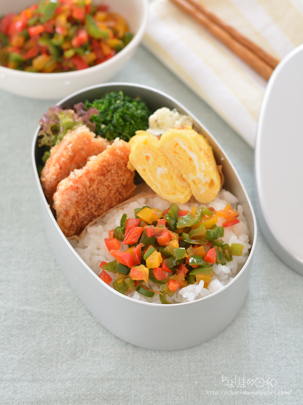 カラーピーマンで作るとおかずに色味がさほどなくとも、ごはんにのせる色味がアップ。