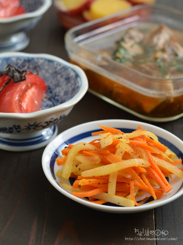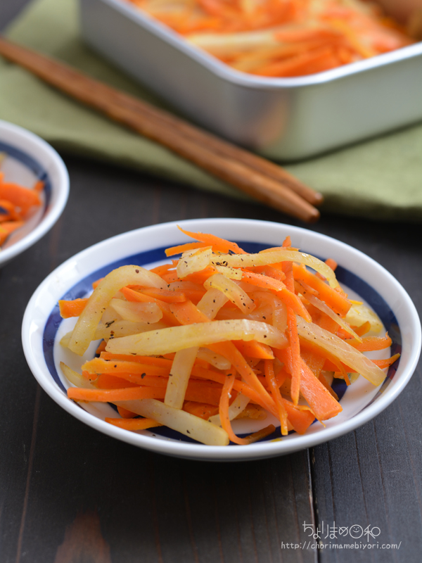 ・大根 250g ・にんじん 1本(250g) ・白だし 大さじ3 ・酢 大さじ1 ・こしょう 少々(強め) ・油 適量