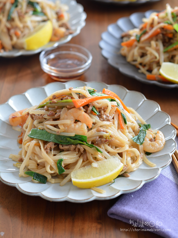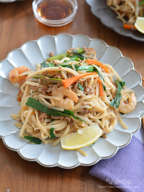 ・ビーフンは下準備をする。 ・冷凍えびは塩水に浸して解凍する。水気をペーパーでふきとる。 ・ニラは長さ3cmに切る。玉ねぎは薄切りにする。にんじんは細切りにする。 1.フライパンに油を入れて中火で熱し、豚肉を入れて炒める。豚肉をほぐして炒め、にんじん、玉ねぎ、ニラ、えびの硬い部分を入れて炒める。 2.具材に火が通ってきたらAを加えてひと炒めする。 3.下準備したビーフン、もやし、残りのニラを入れて炒め合わせる。 4.皿に盛り、カットレモンを添える。お好みでナンプラーをかけていただく。 【POINT】 ナンプラーは使用しなくてもおいしくいただけますが、ナンプラーを加えるとアジアンテイストが深まります。ナンプラーを使わない場合は、にんにく醤油で調味してください。
