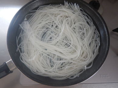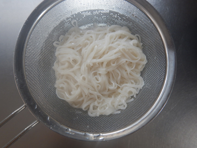★ ビーフン(センレック)の下準備 ①ビーフンはぬるま湯(38℃程度)に40分ほど浸して戻す。 ※フライパンにぬるま湯をはり、ビーフンを入れてほぐす。ふたをしておく。 ②水でほぐし洗いし、ぬめりを落とす。ざるにあげて水気をきる。 ③沸騰して湯に【2】を入れ、30秒ほどゆでる。 ④流水でしめる。ざるにあげて水気をきる。