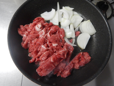 牛肉は硬くならないように玉ねぎを同じタイミングで炒めます。