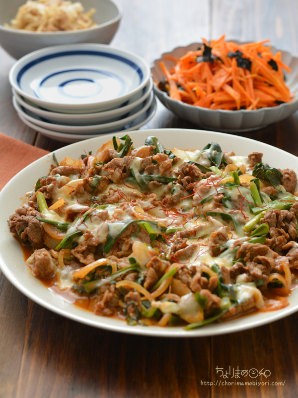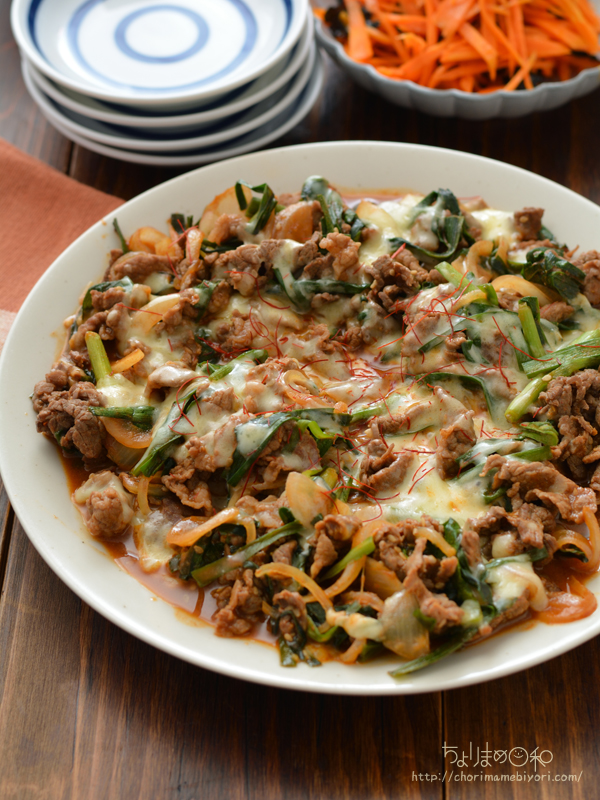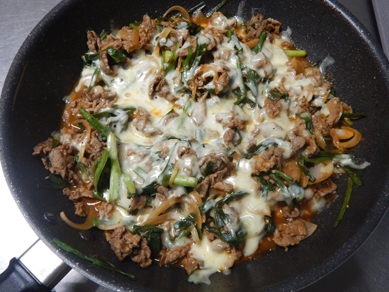 《下準備》 ・牛肉が大きい場合は小さく切る。塩をふる。 ・玉ねぎは薄切りにする。 ・ニラは長さ4cm程度に切る。 ・Aを混ぜ合わせる。 1.フライパンにごま油を入れて中火で熱し、牛肉、玉ねぎを入れて炒める。 2.牛肉の色が変わってきたらA、ニラを順で入れて炒める。 3.全体に調味料が回ったらチーズを散らして蓋をして火を止める。 4.チーズが溶けたら皿に移動させ、お好みで糸唐辛子を散らす。