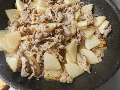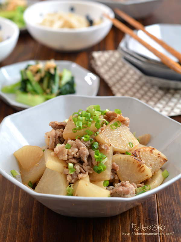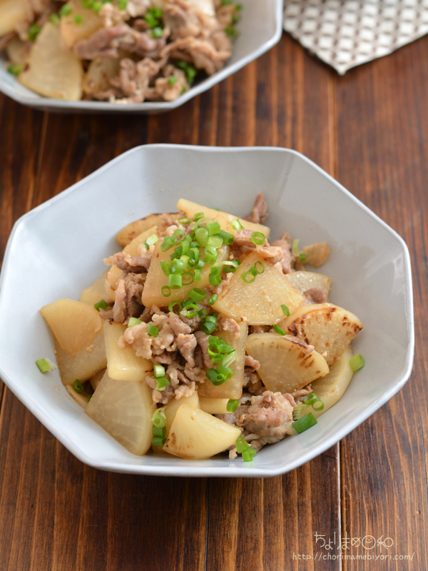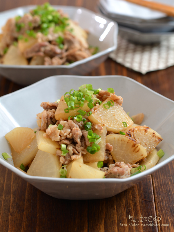 《下準備》 ・豚肉にAをなじませる。 ・大根はいちょう切りにする。 1.フライパンに大根、油、塩を入れて和える。蓋をして中火で全体に焼き色けながら混ぜ炒める。 2.大根を一旦取り出し、下味をつけた豚肉を入れて炒める。 3.豚肉に色が変わったら、大根を戻して炒める。汁気が出てきたら大根に味が含むように炒め煮する。 4.汁気がなくなったら皿に盛り、お好みで小ねぎを散らす。
