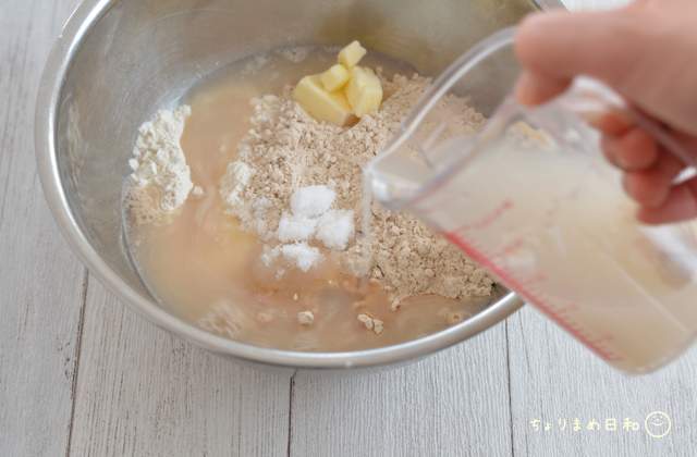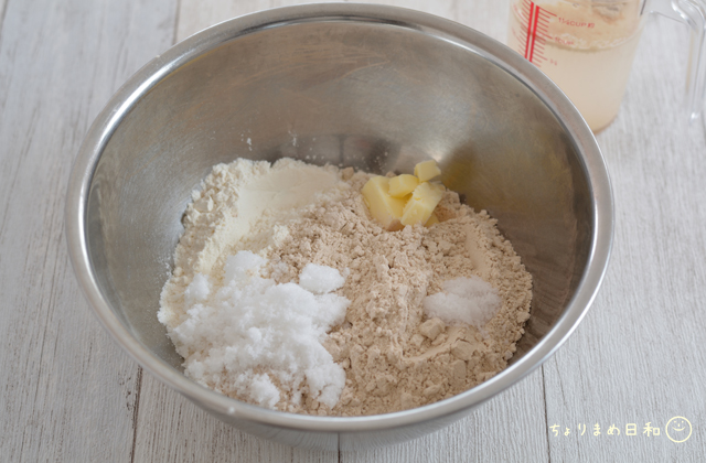 ボウルに強力粉、全粒粉、砂糖、塩、食塩不使用バターをいれましょう。