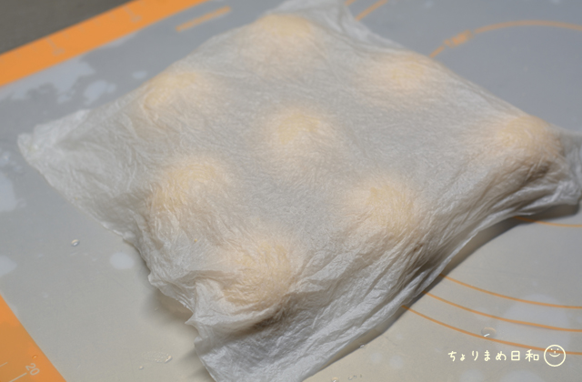 生地を分割して乾燥しないように湿らせたペーパーや布巾をのせて15分ほどおやすみ。
