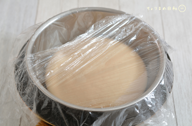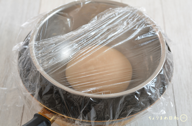 生地の入ったボウルをぽちゃんといれて、フライパンごとラップをして室温におきます。