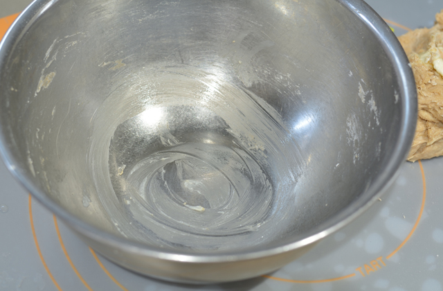 その時に生地の中にバターが残っていたら、そのバターを少しボウルにぬってあげましょう。