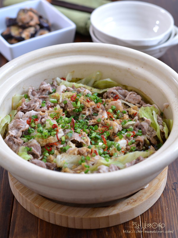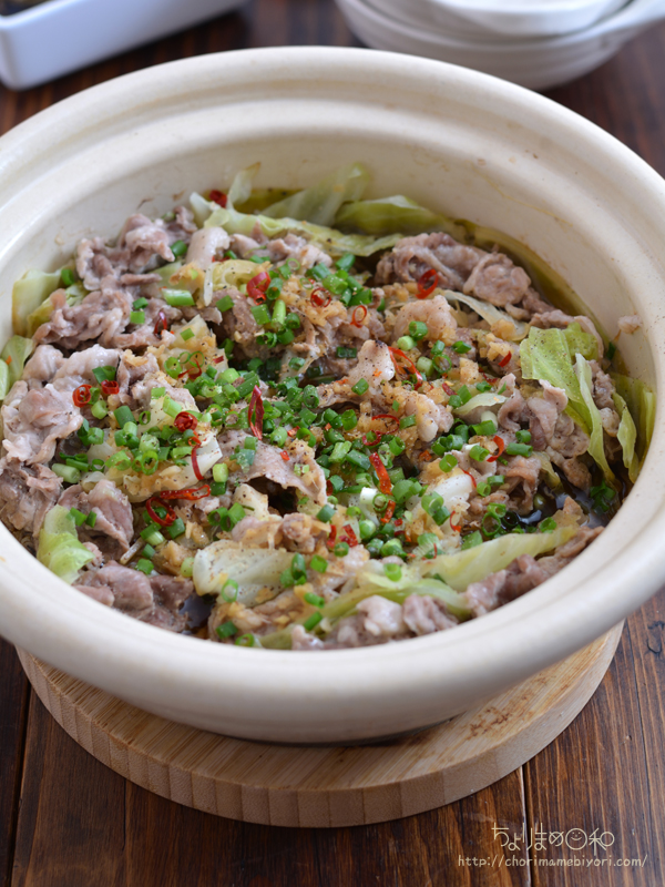 《下準備》 ・キャベツはざく切りにする。 ・Aを混ぜ合わせる。 1.土鍋にキャベツを入れる。キャベツとキャベツの間に豚肉を詰める。 2.Aを回しかける。 3.蓋をして弱めの中火にかけ、湯気が立ったら(約5分後)弱火で10分ほど蒸し煮する。 4.具材に火が通ったら小ねぎ(小口切り)、唐辛子(みじん切り)、粗びき黒こしょうをふる。