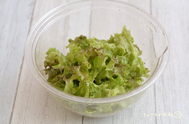 レタスにオリーブ油、酢、塩こしょうでサラダを作ります。