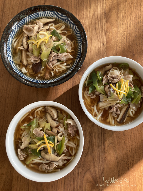 豚こま、しいたけ、ねぎ。だしはめんつゆベースでしょうゆ、みりんで調味。