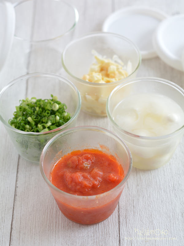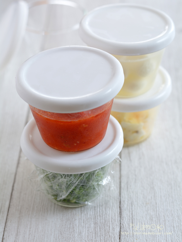 トマトソースがちょっと残ったら、ガラスボウルにいれたいたのをプリンカップに。