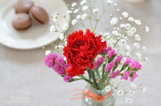 カーネーション、スターチス、カスミソウ。