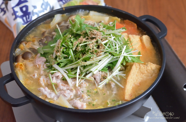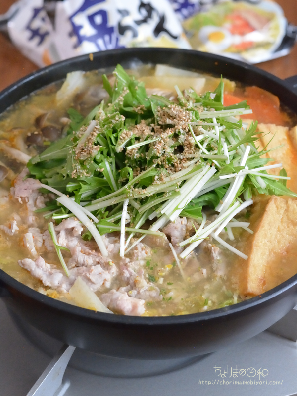 《下準備》 ・厚揚げは熱湯をかけて油抜きする。またはキッチンペーパーで油を吸い取る。 ・お好みの具は適宜下準備する。 1.土鍋に油、にんにく、豆板醤を入れて中火にかける。 2.香りがたったら白菜の芯、葉の順で入れる。長ねぎ、しめじ、にんじん、厚揚げを入れる。酒、水を加えて蓋をして煮る。 3.湯気が立ったら豚肉を入れて煮る。 4.具材に火が通ったら、粉末スープを入れて溶く。水菜をのせて切り胡麻をかける。 5.麺は具材と一緒に煮て食べる。具を食べきってシメで麺を食べる場合は、水(200~300ml)を加えて煮る。 ※麺を具材と一緒にいただく場合、つゆが濃くなったときは水を適量加えていだだく。