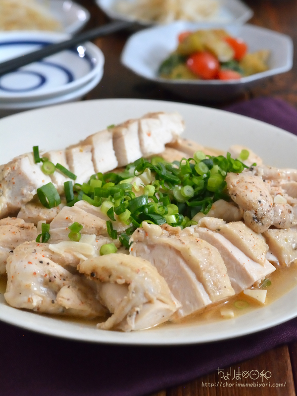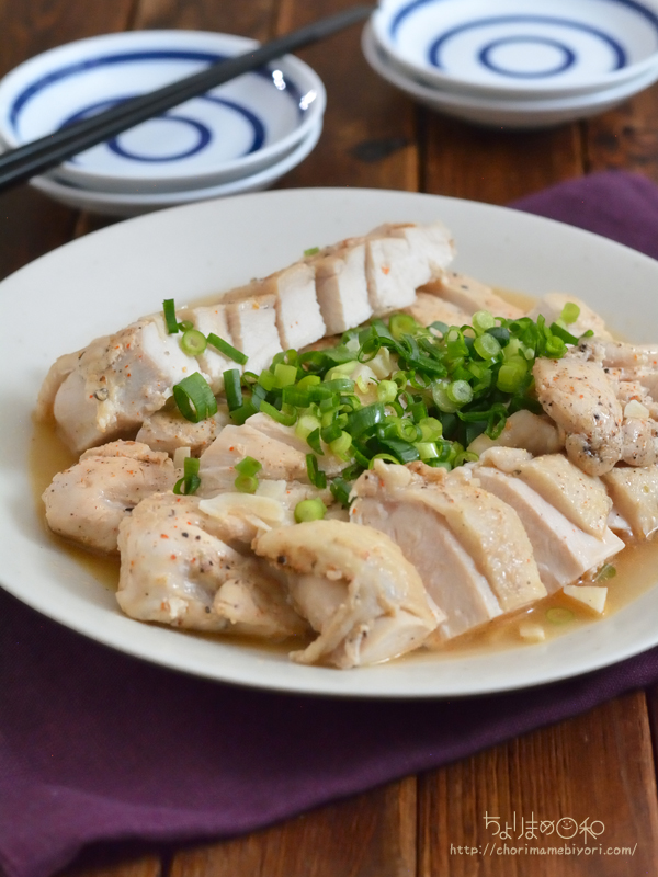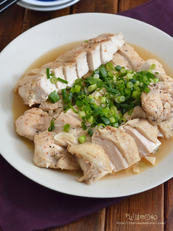 ・鶏むね肉 2枚(600g程度) ・塩 小さじ1・1/3 ・七味唐辛子 小さじ1/3~ ・粗びき黒こしょう 小さじ1/3~ ・にんにく(みじん切り) 1片分 ・ごま油 大さじ2 ・酒 大さじ2 ・小ねぎ(小口切り) 適宜