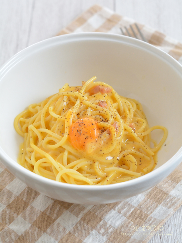 レンジでこのとろっとしたソースができるんだと驚くカルボナーラ。