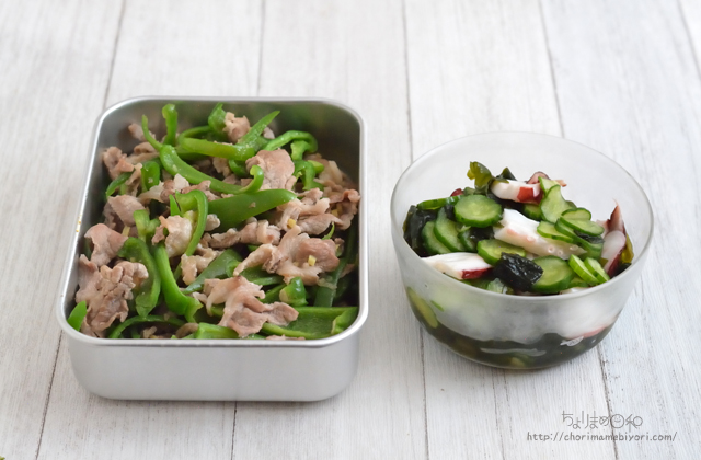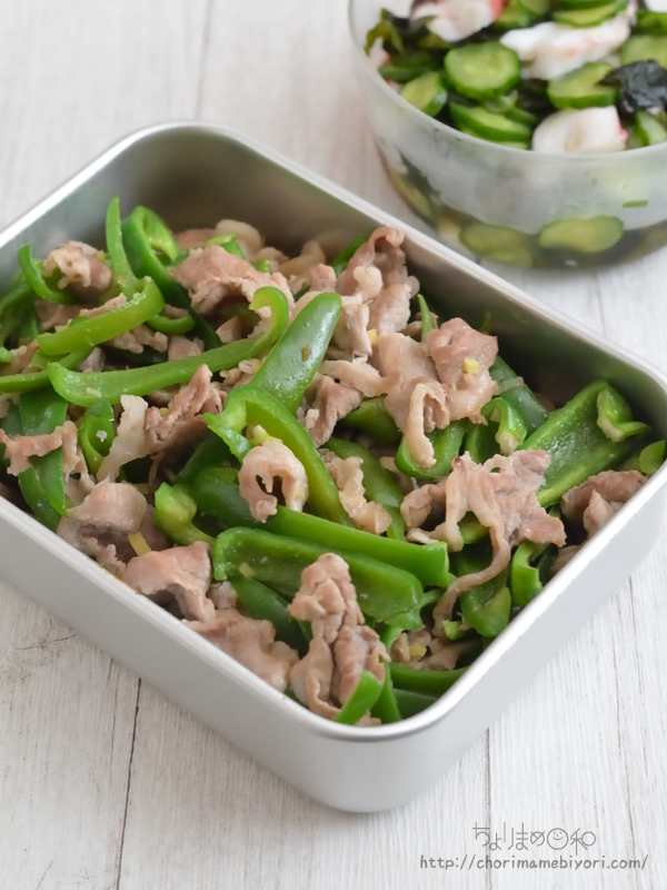 豚こま切れ肉とピーマンをにんにく、しょうがと油で炒めて、塩、こしょう、酒で調味。