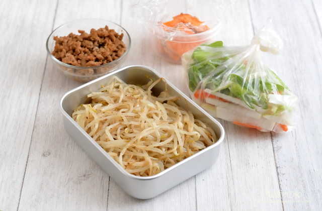 もやしのお浸し、半端な豚ひき肉はそぼろに、焼いただけの塩鮭、味噌汁用のカット野菜。
