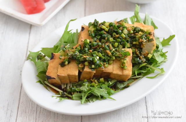 薬味醤油の残りはこんがりとグリルで焼いた厚揚げにかけて。