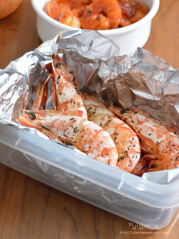 1.魚焼きグリルにアルミホイルをしき、えびを並べる。