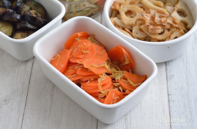 にんじんは塩と油で炒めて、しらすを加えてさらに炒める。